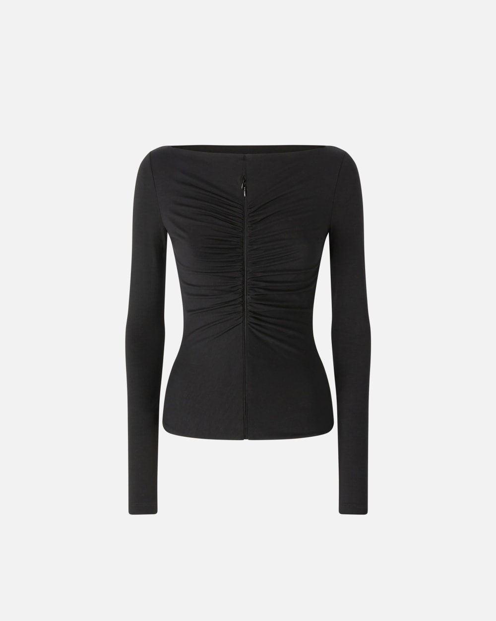 Maglia a maniche lunghe dalla linea molto aderente in jersey modal stretch, un tessuto particolarmente caldo alla mano. La silhouette segue le linee del corpo, valorizzandole anche grazie al motivo di arriccio davanti. Lo scollo dritto e la zip invisibile davanti personalizzano la maglia, capo perfetto da indossare tutti i giorni.