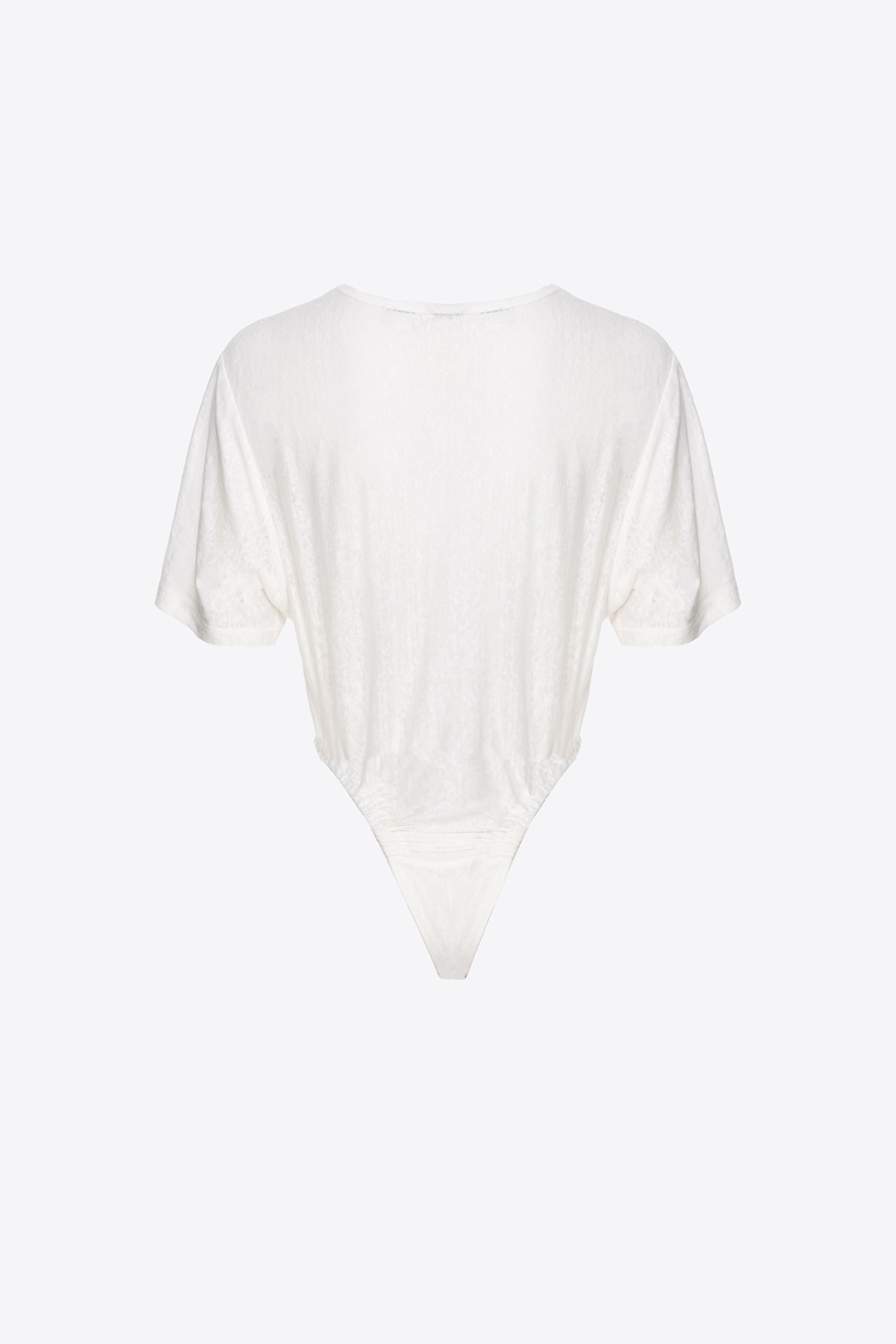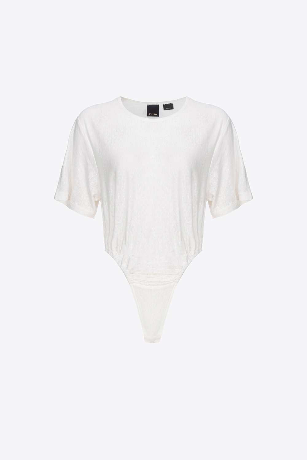 Body a maniche corte in lino fiammato, lavorazione con filati di spessore variabile che danno vita a una particolare texture irregolare. Linea sgambata che crea arricci.
