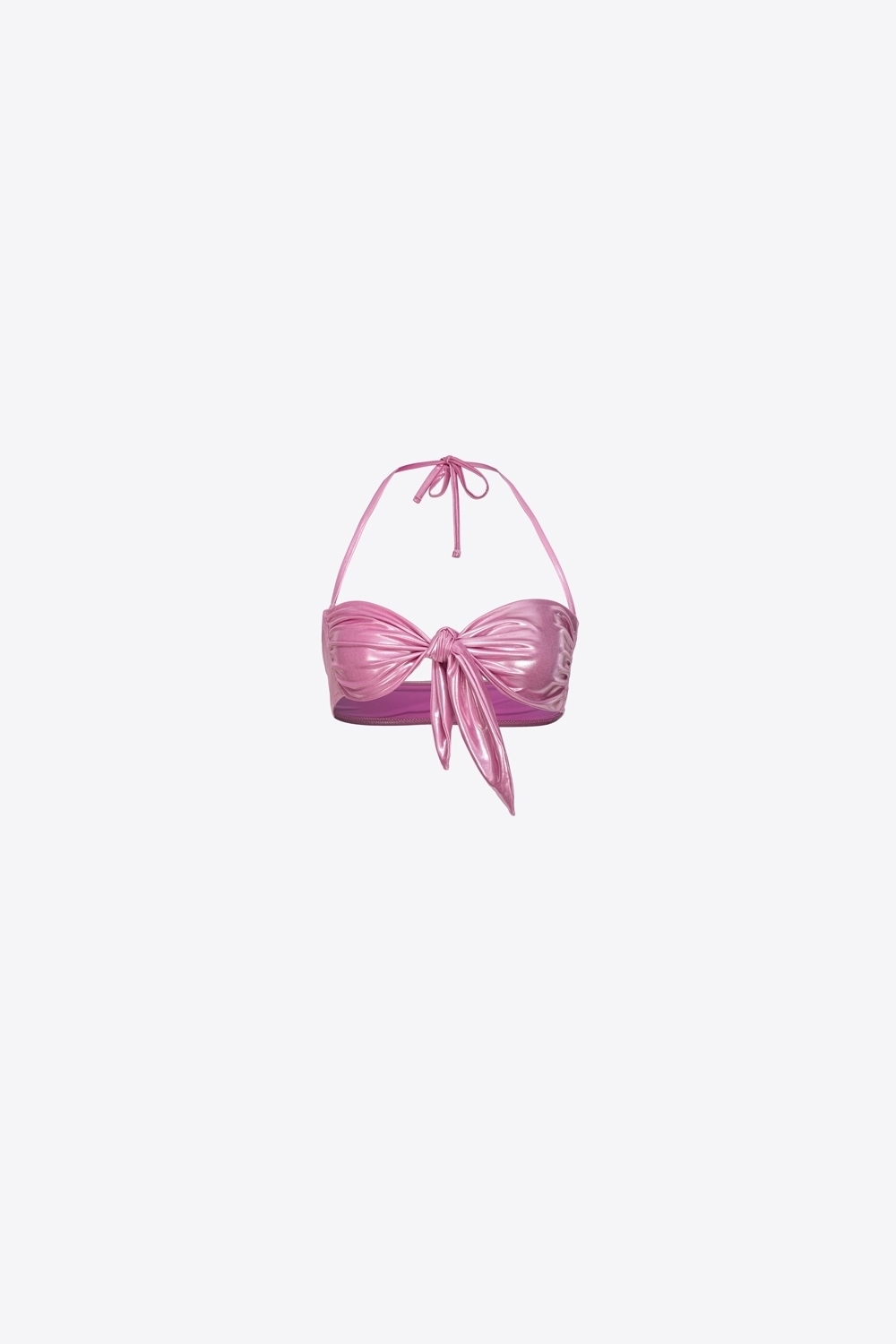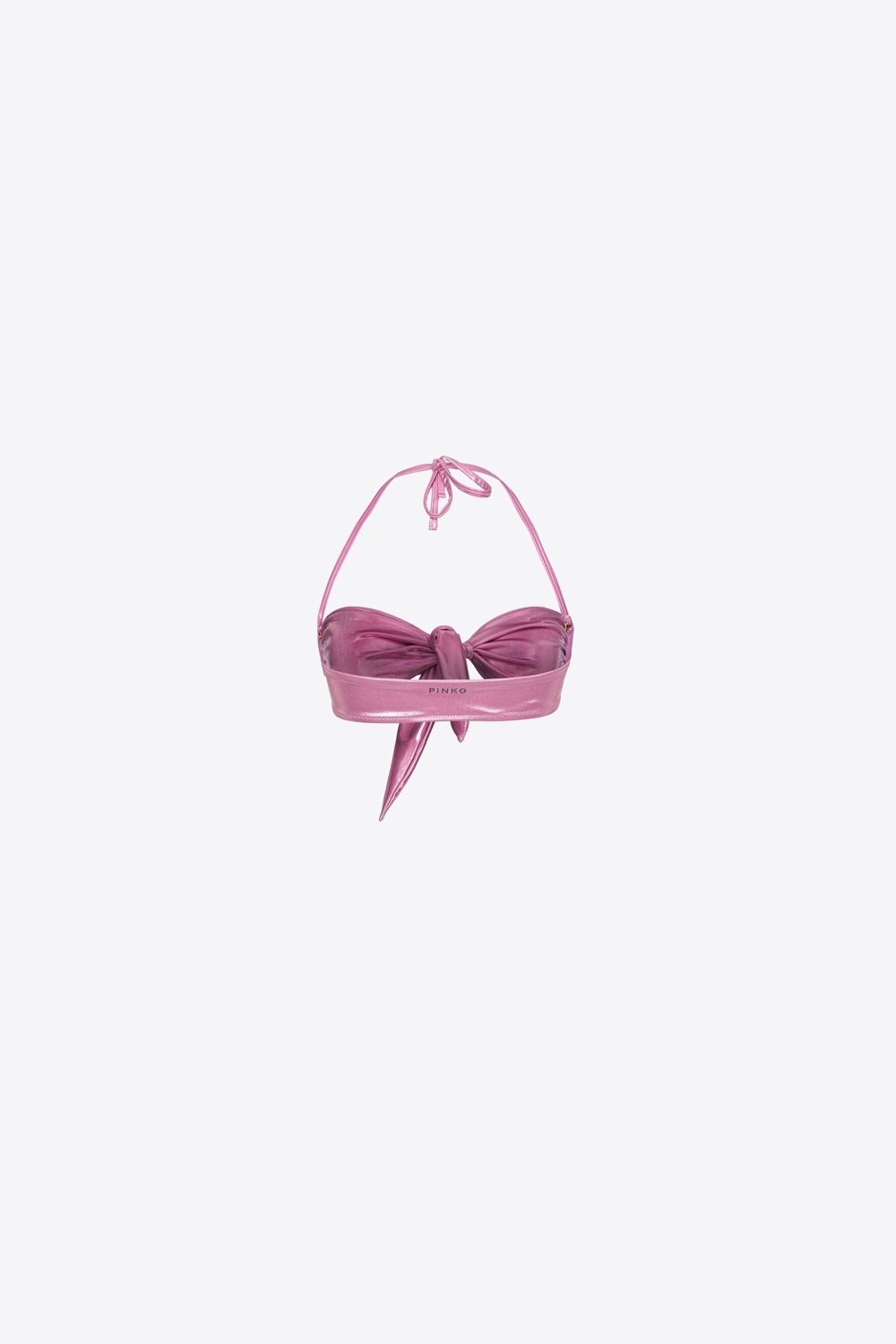 Top bikini a fascia in tessuto tecno jersey stretch laminato dal particolare effetto bagnato. Dettaglio annodato davanti e laccetti da annodare dietro il collo, rimovibili per una portata senza spalline. Logo PINKO stampato sul retro.