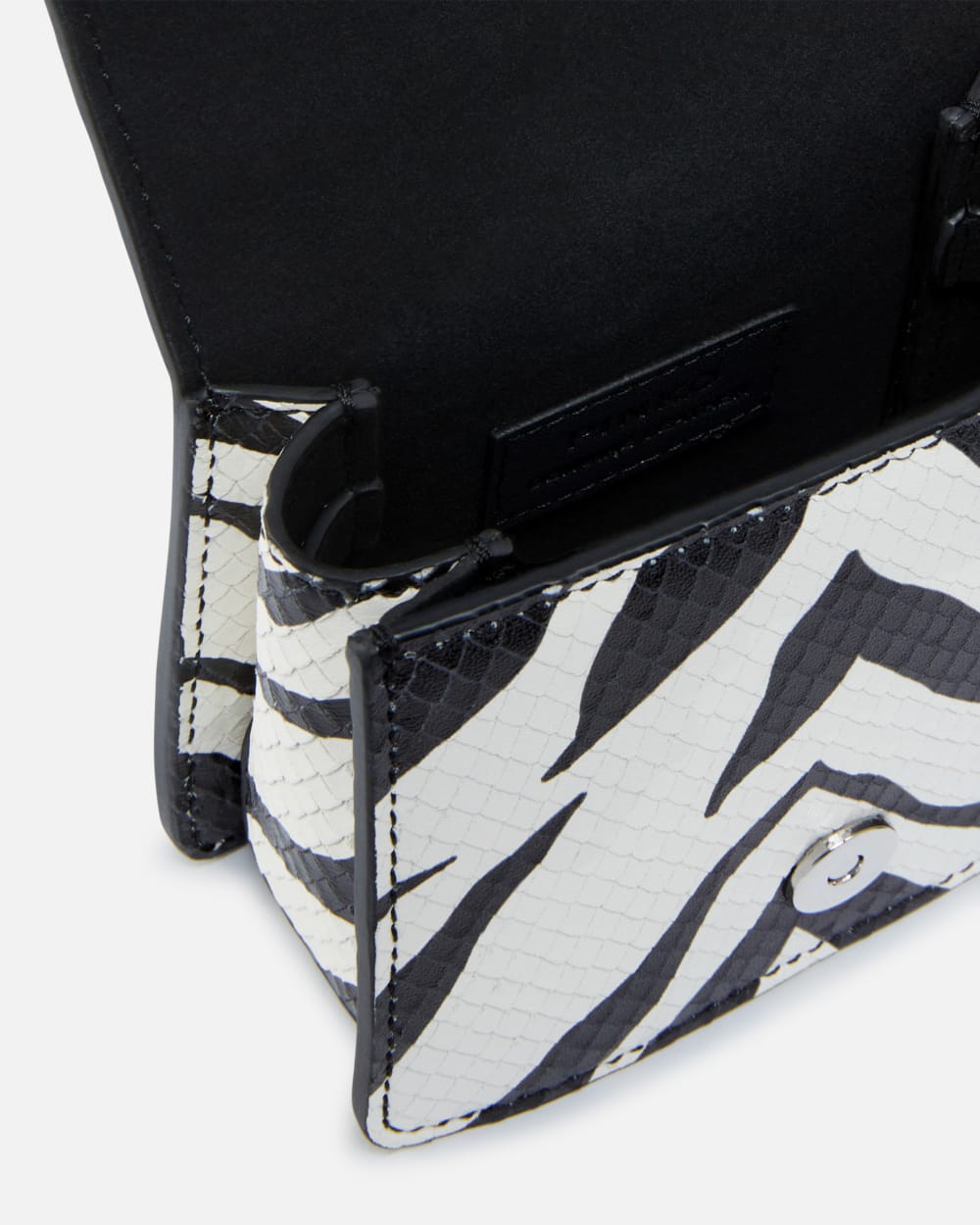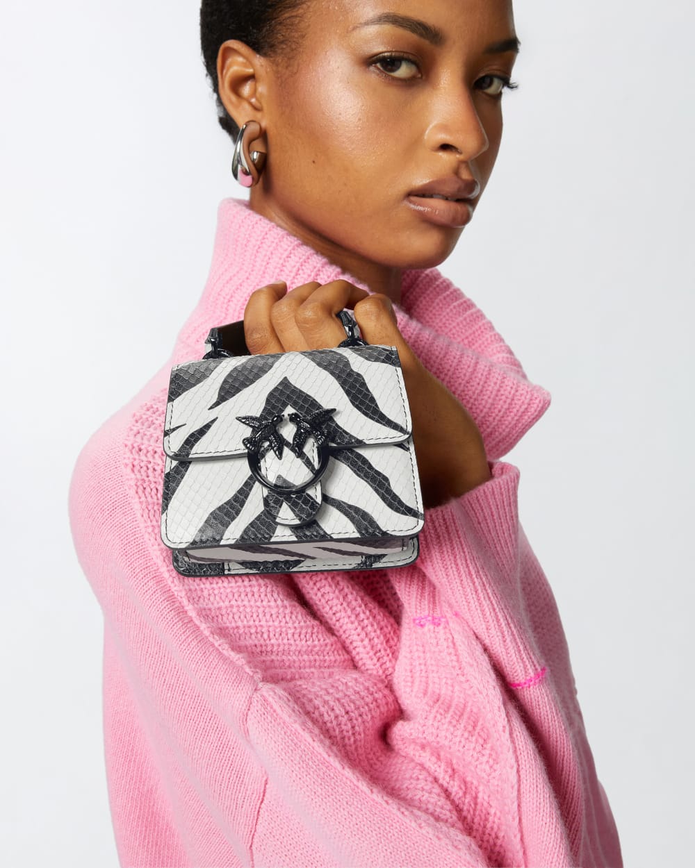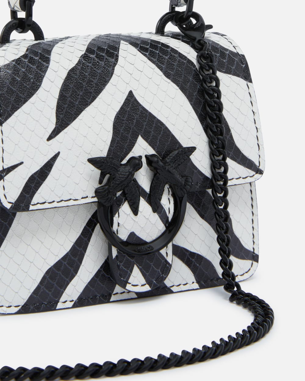 Borsetta a mano Micro Love Bag dalla forma a trapezio, leggera e destrutturata, in pelle stampata con motivo rettile e rifinita con disegno intagliato animalier zebra bicolore, bianca e nera. La chiusura della borsa è completata dall’iconica fibbia Love Birds Diamond Cut in metallo smaltato nero lucido, mentre l’interno è foderato in tessuto a contrasto di colore. La piccola borsa ha le giuste dimensioni per contenere gli essenziali e completare un look da occasione speciale ed è completa di manico superiore per portare la borsa a mano, ma anche di piccola tracolla rimovibile in metallo. Attiva la tua borsa PINKO: verifica l’autenticità del tuo prodotto e accedi all’esperienza personalizzata avvicinando il tuo smartphone al ricamo Love Birds che trovi sul retro della borsa!