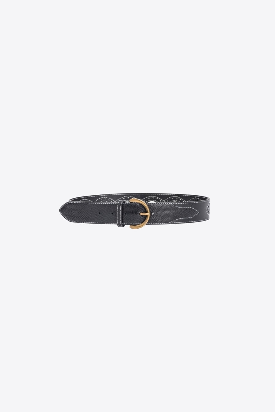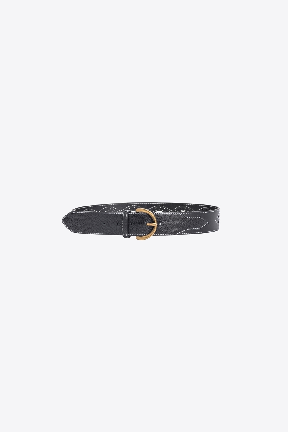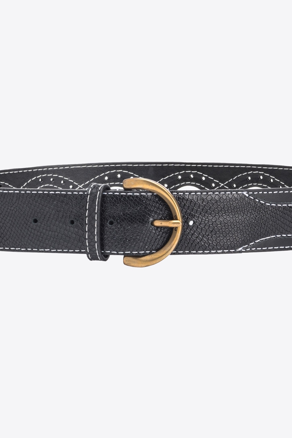 Cintura 5cm, da indossare alta in vita, in pelle con impunture a contrasto e inserti stampa pitone. Dettaglio di trafori e motivo cut-out sul retro. Fibbia a mezzaluna taglio diamante in metallo, galvanica antique gold, personalizzata con logo PINKO.