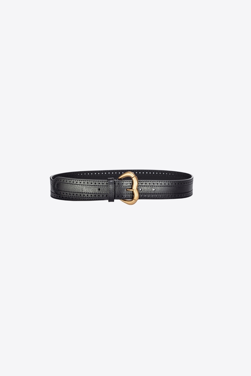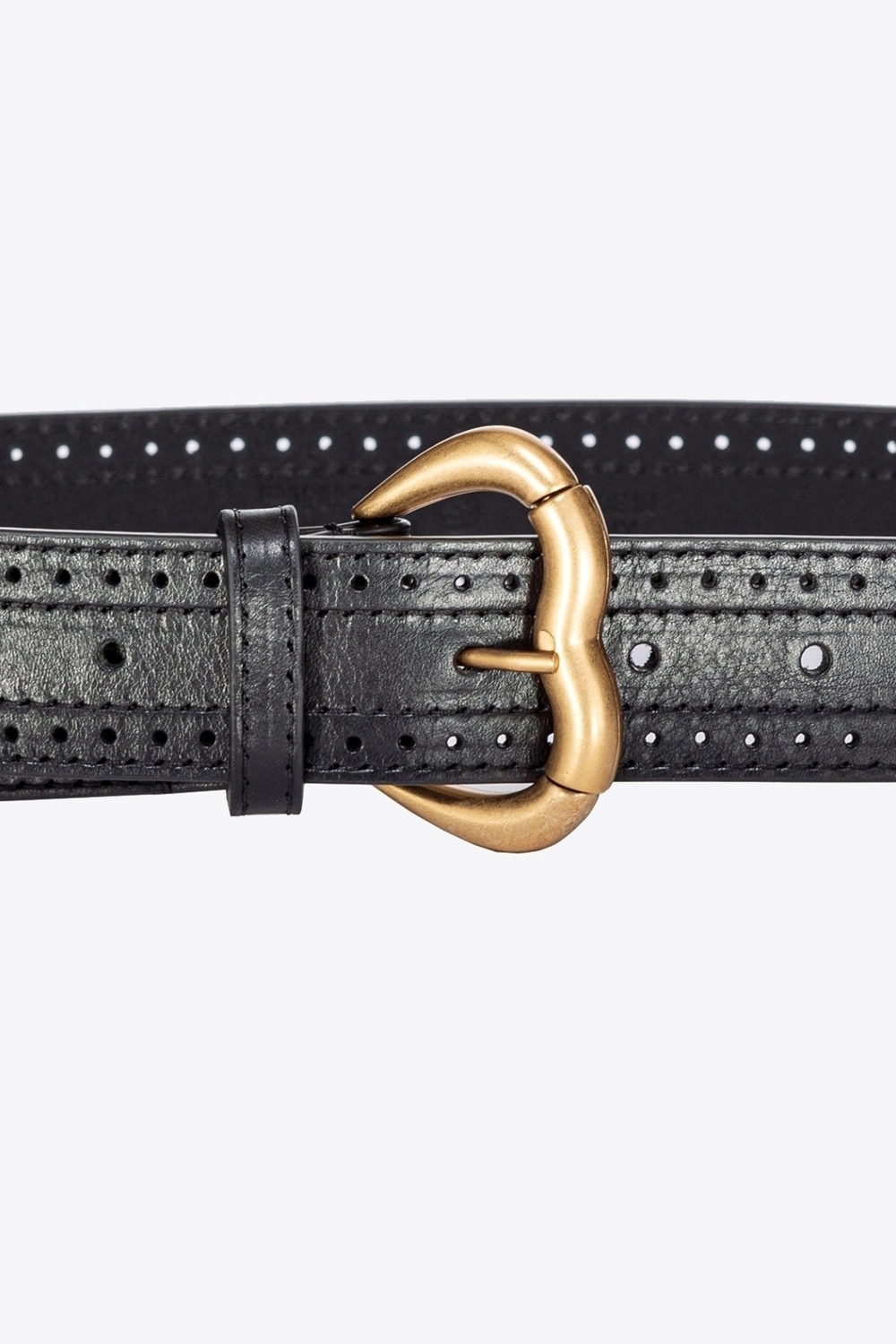 Cintura alta 3,5cm in cuoio con lavorazione microforata su tutta la lunghezza. Fibbia Jolene a forma di cuore con rullo in metallo, galvanica chocolate gold.