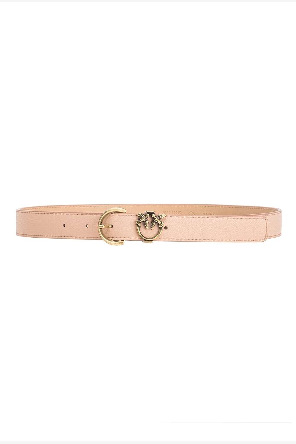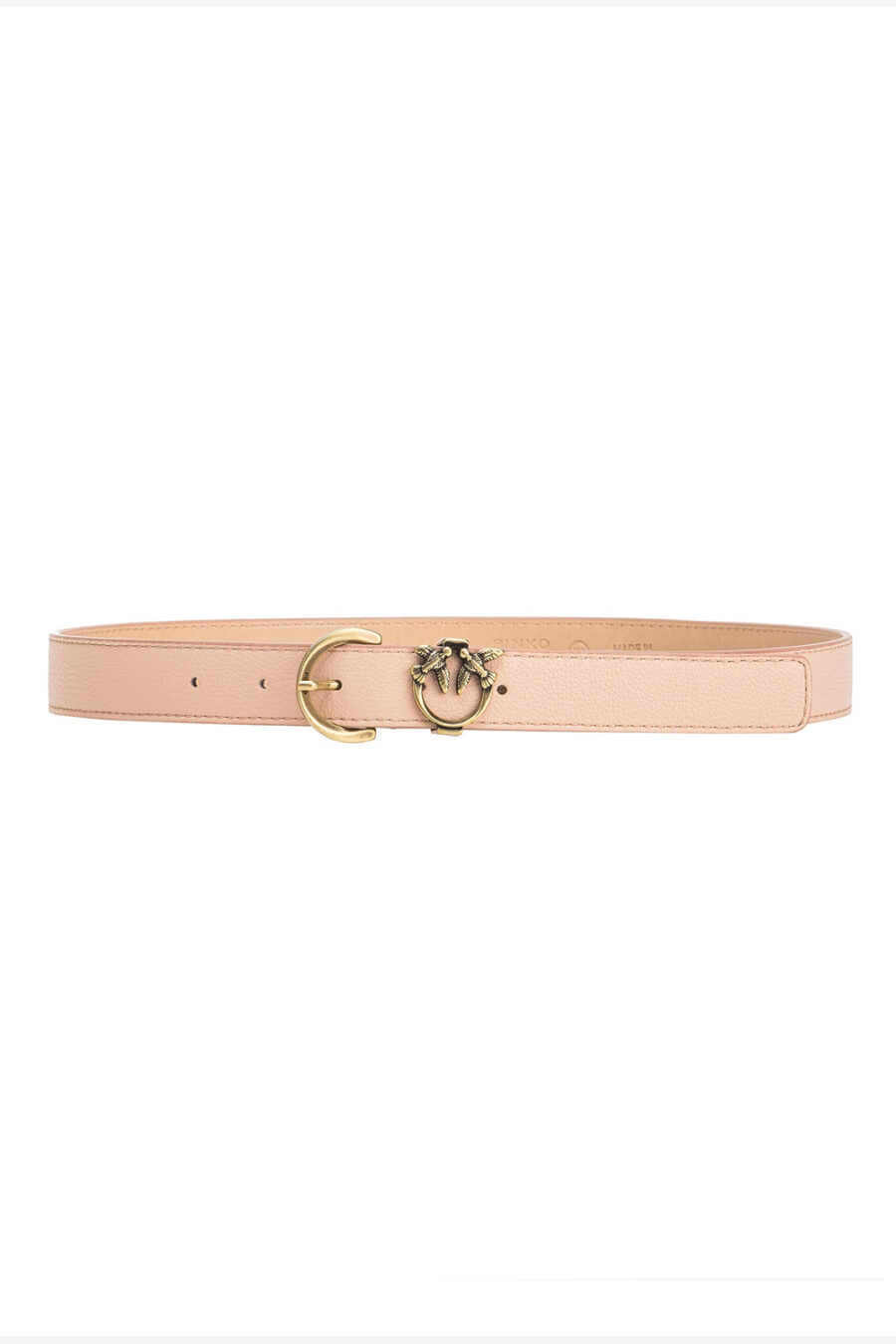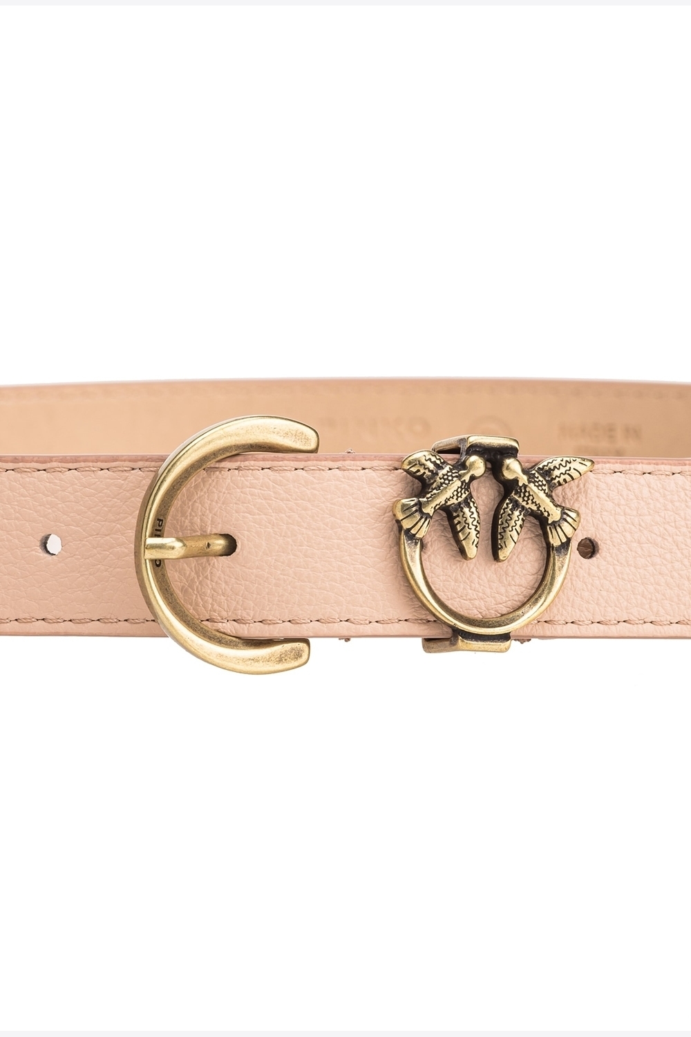 Cintura sottile in pelle bottalato caratterizzata da dettaglio metallico con placchetta Love Birds Diamond Cut e fibbia a mezzaluna, galvanica antique gold.
