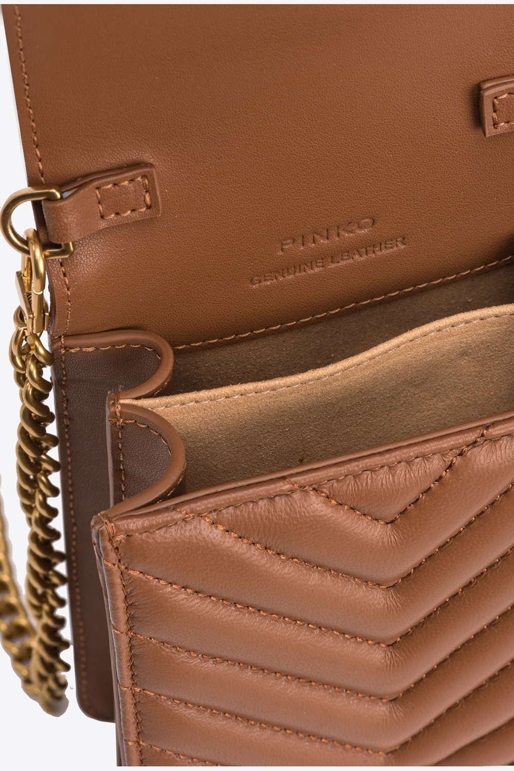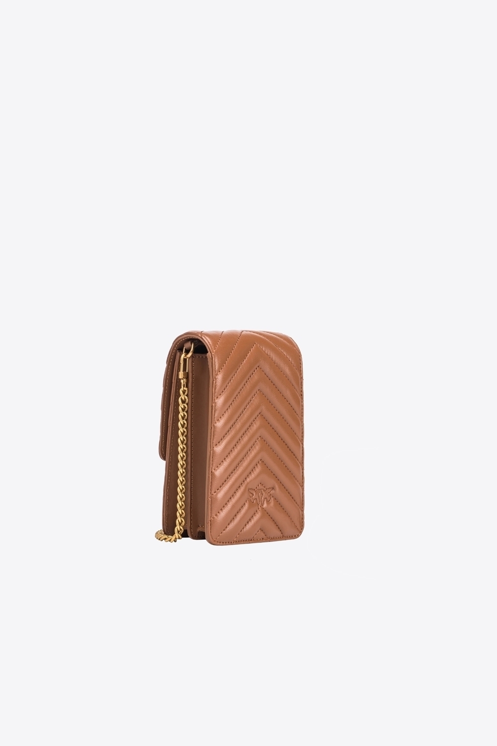 Custodia porta smartphone in nappa trapuntata con motivo chevron, con chiusura personalizzata con fibbia Love Birds Diamond Cut in metallo. L’interno è foderato in microfibra scamosciata e comprende tramezza che divide lo spazio in due scomparti. Completa di tracolla a catena metallica rotonda sottile rimovibile.