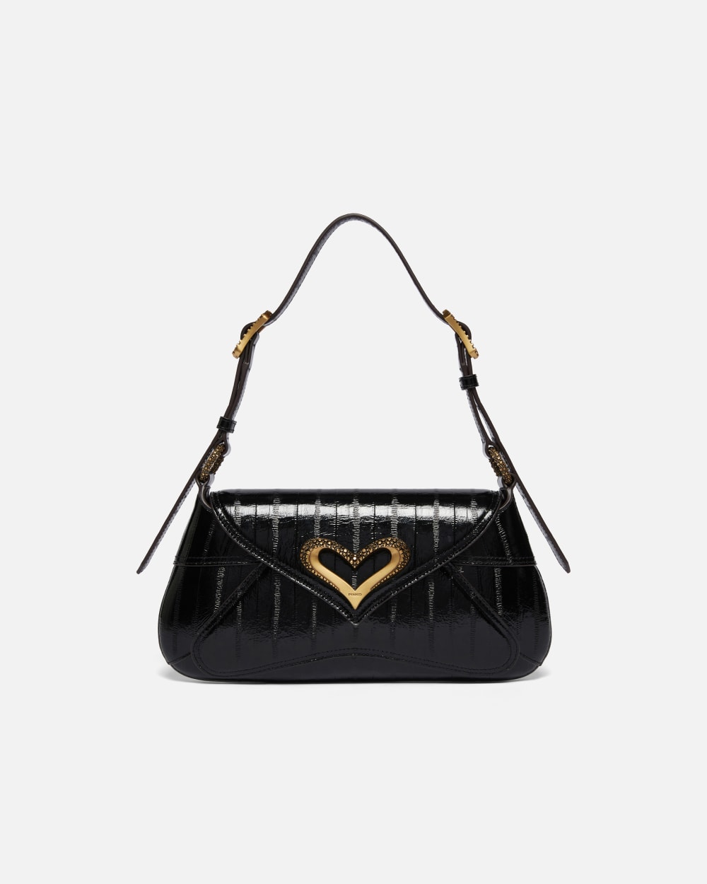 Borsa a spalla 520 Bag in pelle verniciata con stampa anguilla. La borsa si caratterizza per una shape rettangolare con angoli stondati e chiusura con patta a punta personalizzata con fibbia a forma di cuore in metallo intagliata con motivo di micro borchie. L’interno della borsa è foderato in tessuto scamosciato e comprende pratica tasca chiusa con zip. La borsa è completa di tracolla in pelle regolabile per la portata a spalla. Il nome della borsa si ispira a un comune slang cinese: la pronuncia di “520” in cinese, infatti, suona molto simile alla pronuncia della frase “ti amo”. Inoltre, il 20 maggio coincide con una delle cinque Feste degli Innamorati in Cina. Attiva la tua borsa PINKO: verifica l’autenticità del tuo prodotto e accedi all’esperienza personalizzata avvicinando il tuo smartphone al ricamo Love Birds che trovi sul retro della borsa!