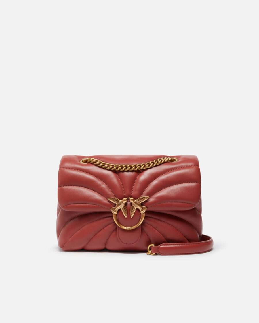 Borsa a tracolla grande Classic Love Bag Puff realizzata in morbida nappa trapuntata con motivo Butterfly a farfalla. La chiusura della borsa è completata dalla fibbia in metallo, galvanica antique gold, con logo uccellini Love Birds Diamond Cut, mentre l’interno, foderato in tessuto effetto scamosciato, include tasca a parete e tramezza chiusa con zip. La tracolla scorrevole combina la classica catena metallica al pratico spallaccio in nappa, e può essere doppiato per indossare la borsa a spalla. Attiva la tua borsa PINKO: verifica l’autenticità del tuo prodotto e accedi all’esperienza personalizzata avvicinando il tuo smartphone al ricamo Love Birds che trovi sul retro della borsa!