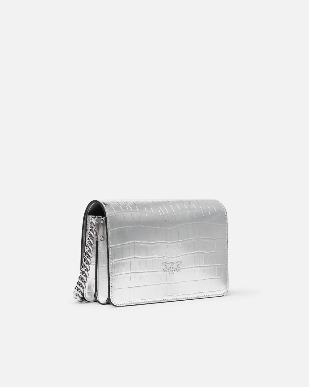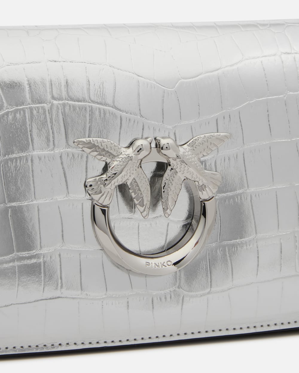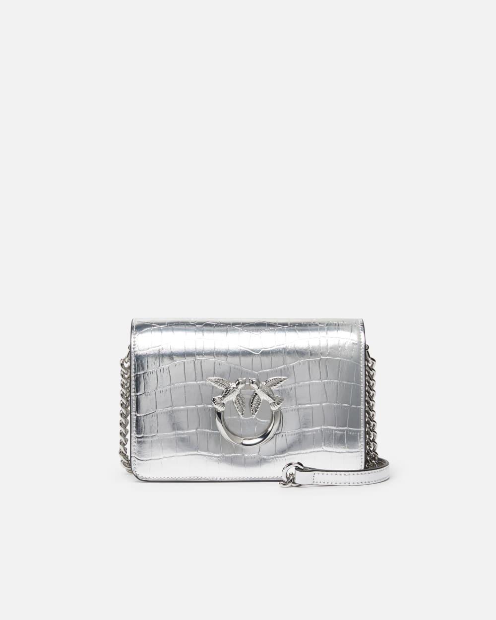 Piccola borsa a tracolla Mini Love Bag Click realizzata in pelle stampa coccodrillo lavorata con rifinitura metallizzata a specchio color argento: un tocco davvero originale per i look di tutti i giorni o il completamento perfetto per un outfit da sera speciale. L’interno della borsetta è foderato in microfibra scamosciata e comprende una pratica tramezza chiusa con zip per meglio gestire e organizzare gli spazi, mentre la chiusura magnetica con patta è completata con l’iconica fibbia Love Birds Diamond Cut in metallo, galvanica shiny nichel, con motivo di cut-out. La borsa è completa di tracolla a catena metallica che include uno spallaccio in pelle per una portata più comoda sulla spalla. Attiva la tua borsa PINKO: verifica l’autenticità del tuo prodotto e accedi all’esperienza personalizzata avvicinando il tuo smartphone al ricamo Love Birds che trovi sul retro della borsa!