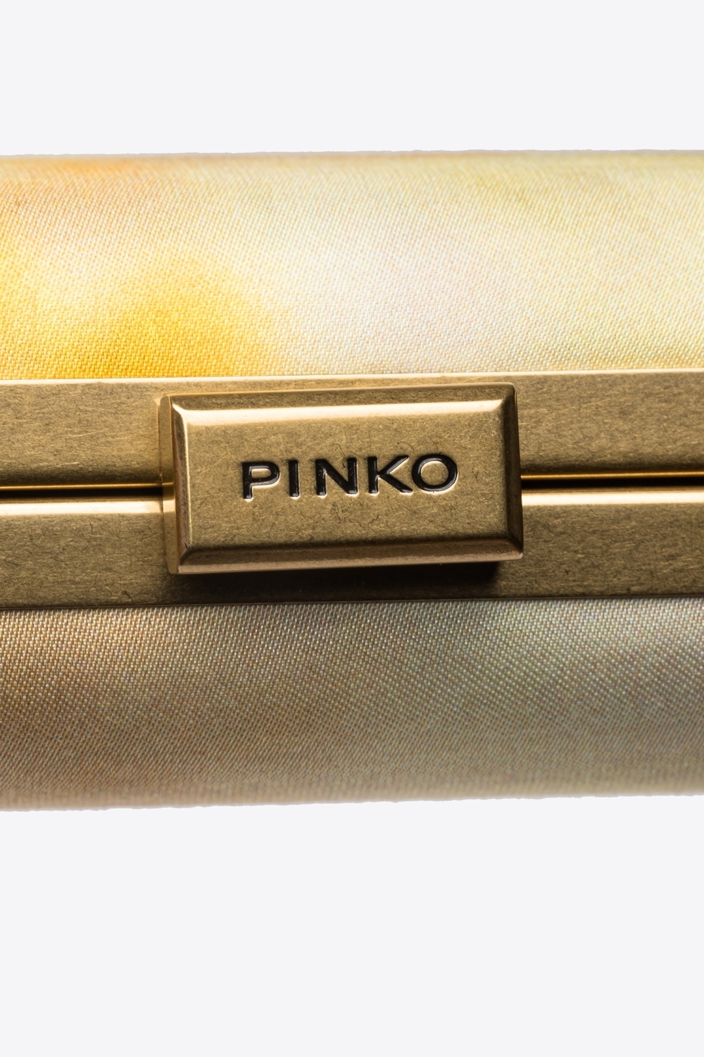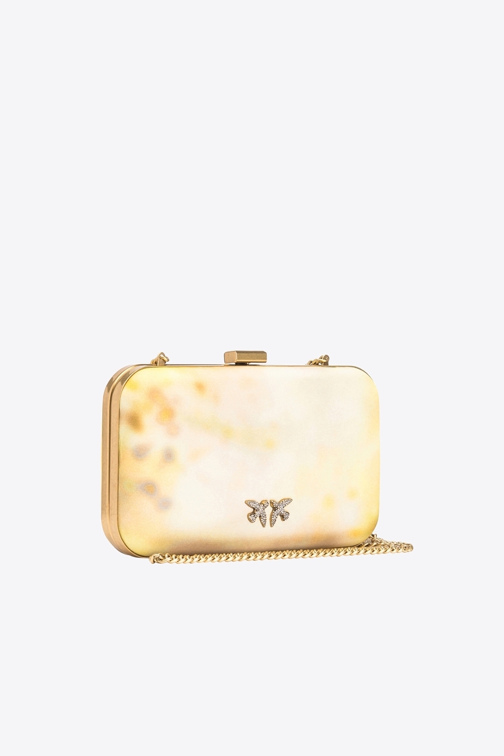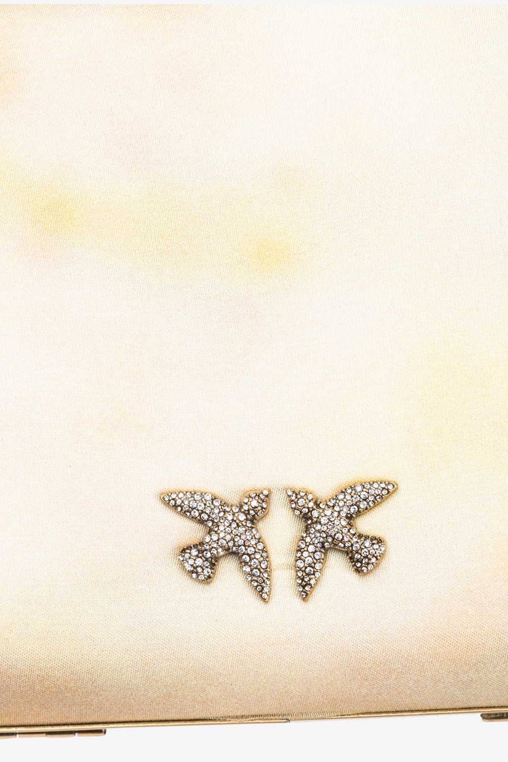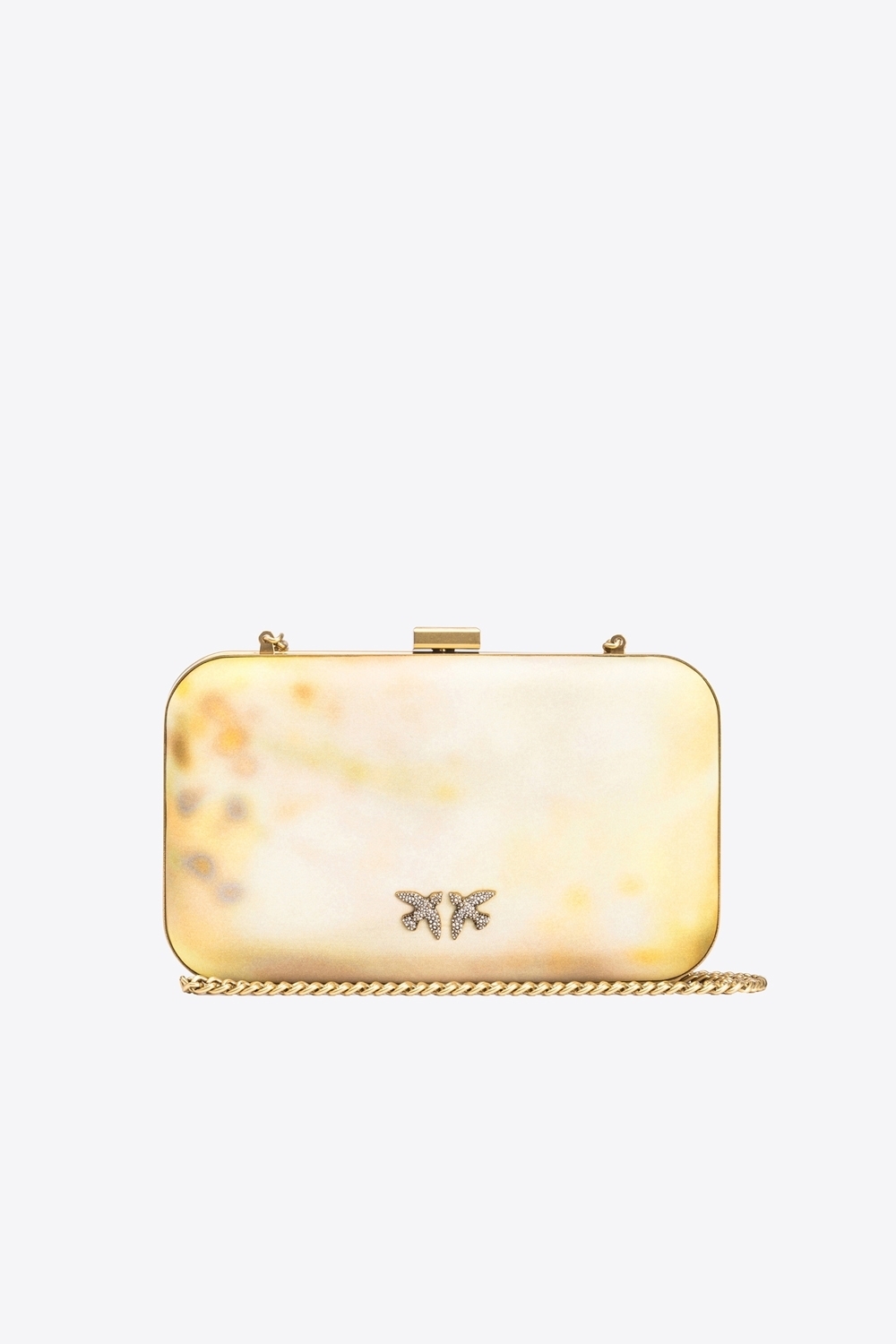 Clutch rigida dalla forma rettangolare in satin con stampa sfumata. L’interno è foderato in microfibra scamosciata. Completa di tracolla a catena sottile in metallo. Chiusura a scatto e personalizzazione con logo Love Birds uccellini in metallo, impreziosito con pavè di strass.