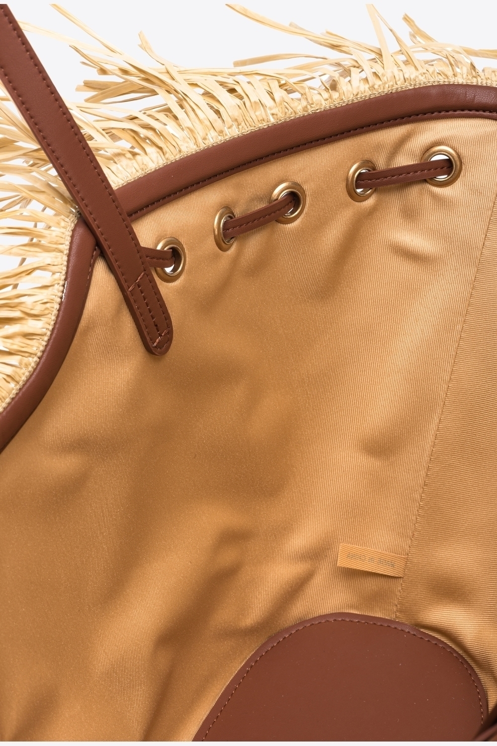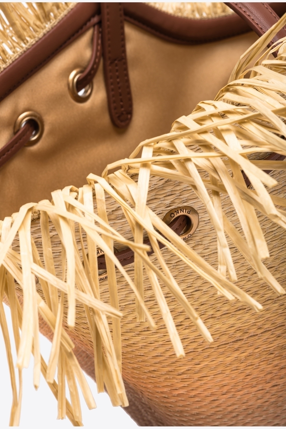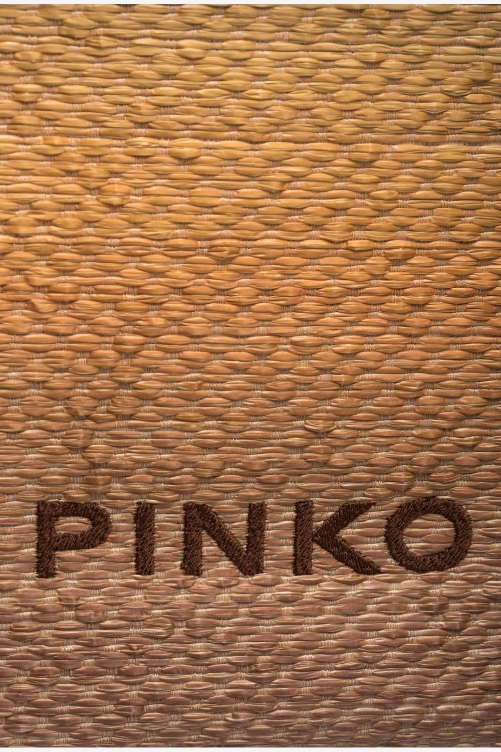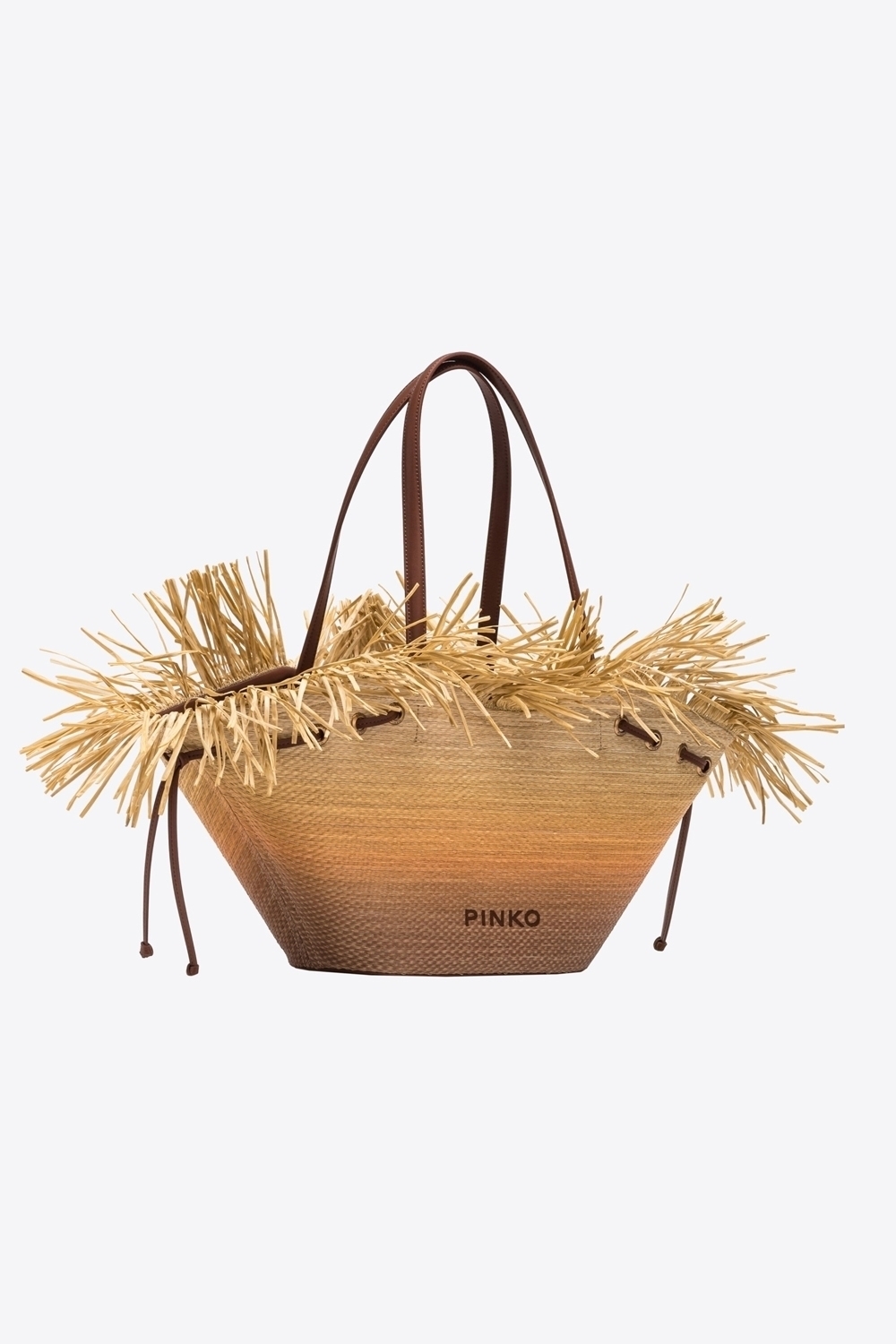Extra Pagoda Shopper in rafia panama sfumata con aerografo caratterizzata da una particolare forma trapezoidale. Personalizzazione con frange, coulisse in pelle inserita con occhielli in metallo e ricamo logo PINKO. Foderata in cotone riciclato. Attiva la tua borsa PINKO: verifica l’autenticità del tuo prodotto e accedi all’esperienza personalizzata avvicinando il tuo smartphone al ricamo Love Birds che trovi sul retro della borsa!