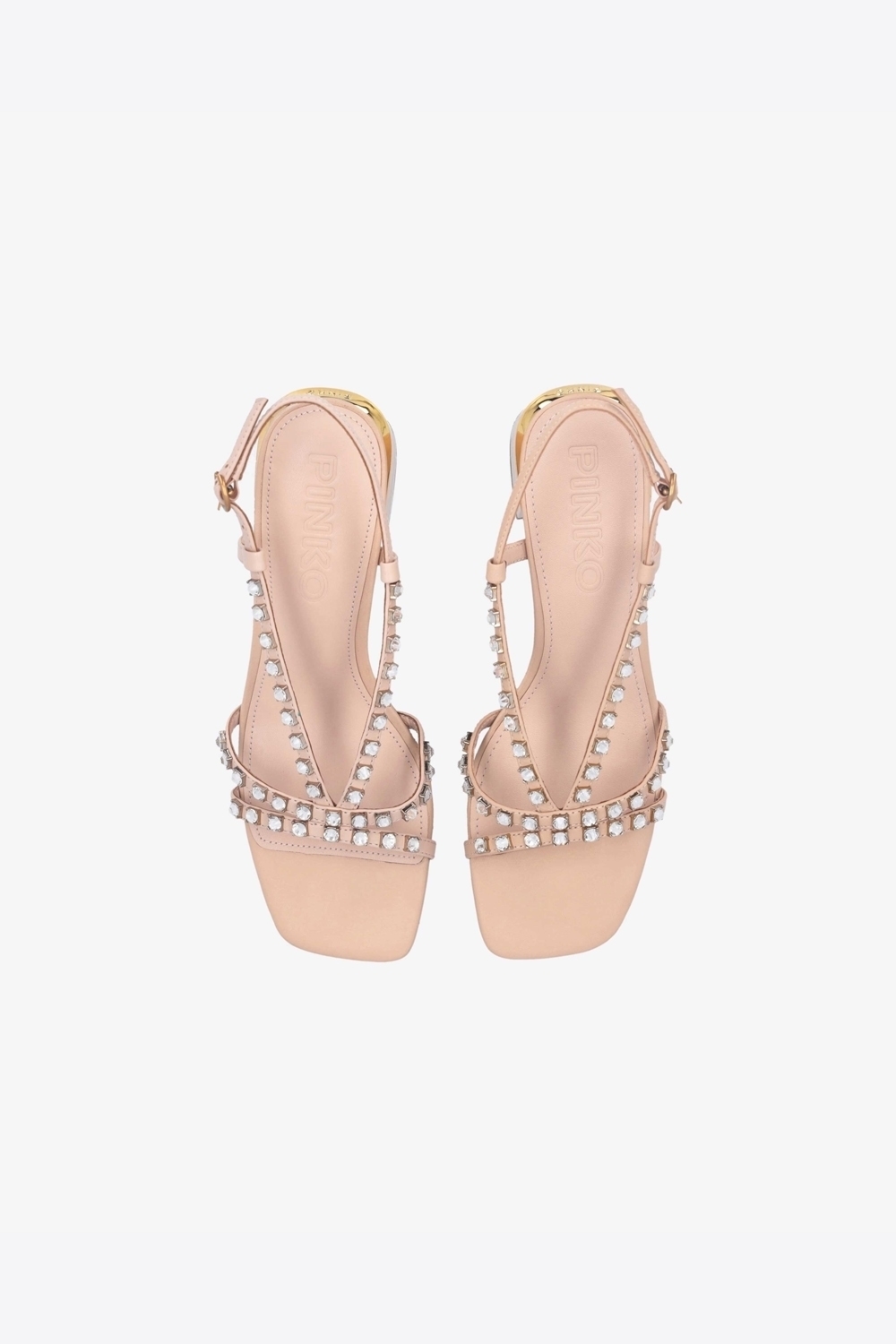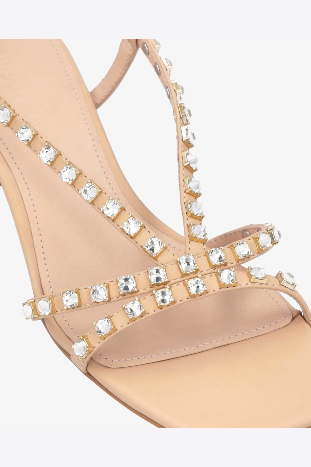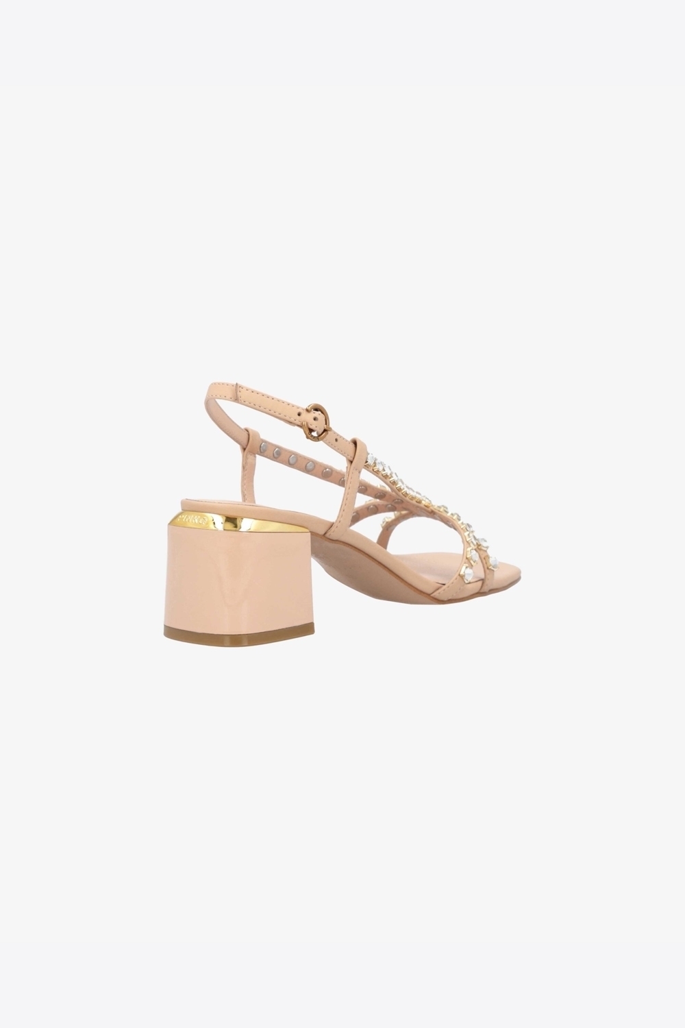 Sandali in nappa con fascette sottili davanti caratterizzate da applicazioni gioiello e cinturino che allaccia alla caviglia con cinturino in metallo di forma rotonda. Punta squadrata e suola in tunit, un materiale sintetico con caratteristiche simili al cuoio, con tacco chunky quadrato dorato 6 cm, fodera e soletta in pelle.