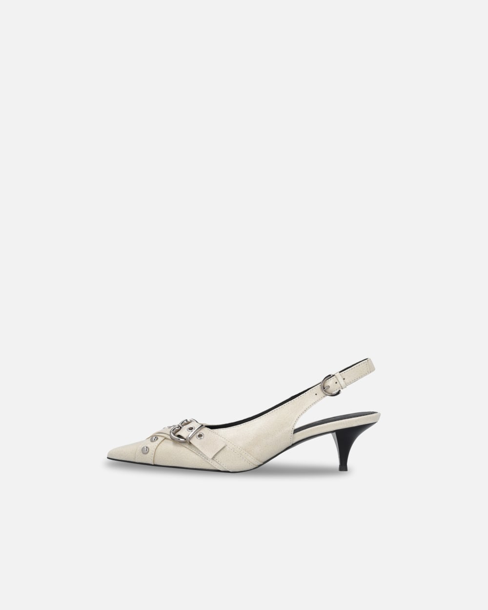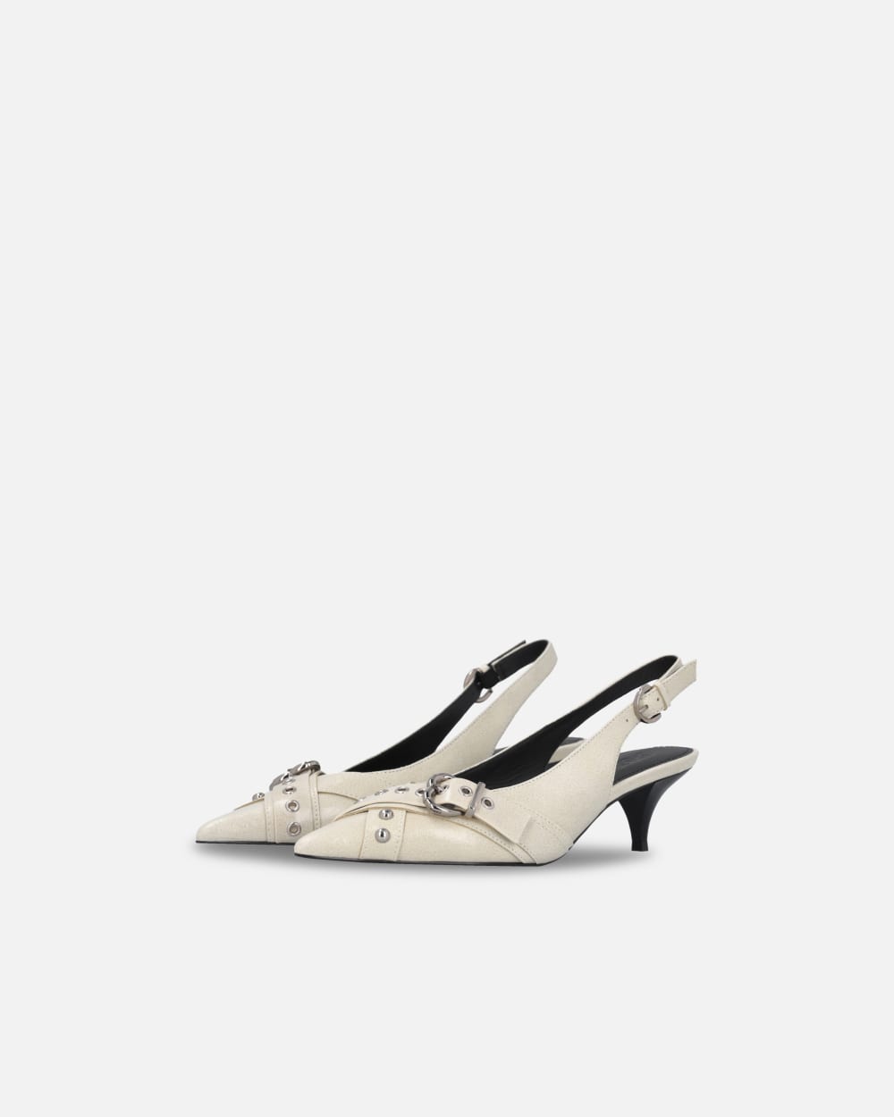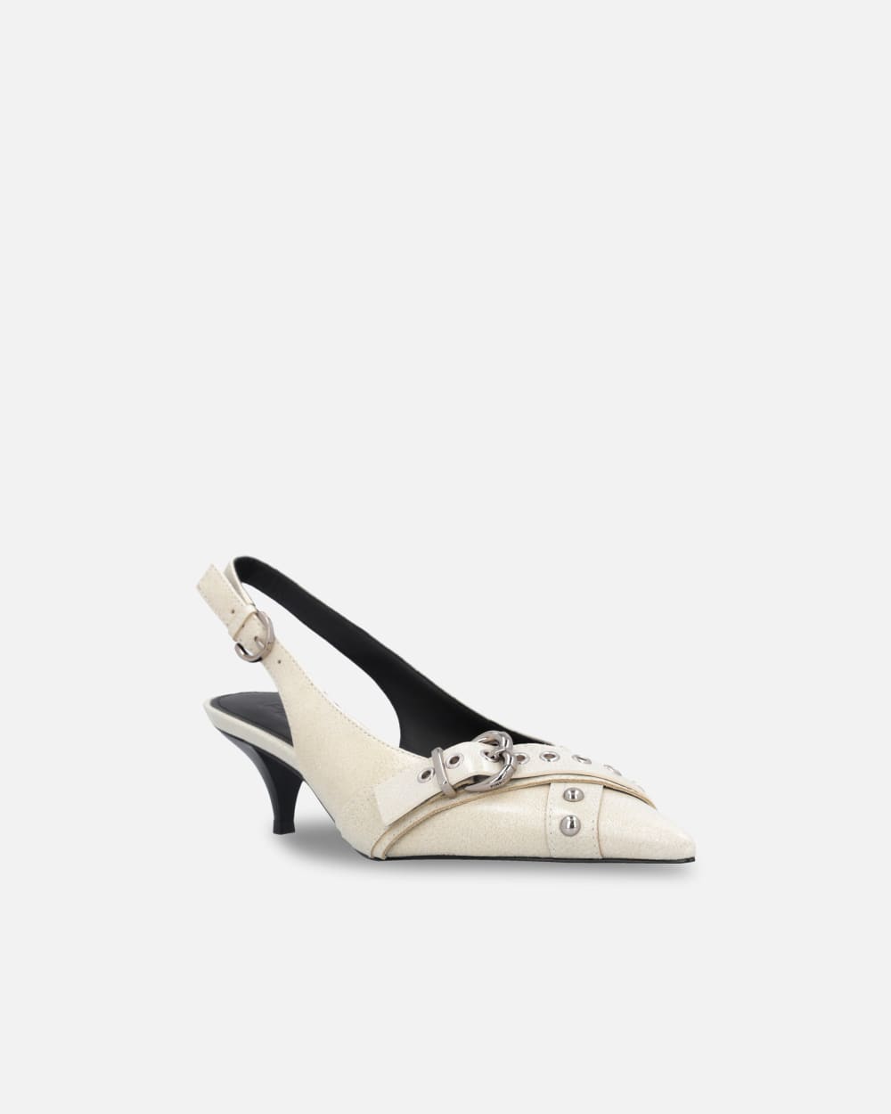 Scarpe slingback in pelle, con applicazione di borchie e cinturino con fibbia metallica a forma di cuore davanti. Punta sfilata, cinturino regolabile con piccola fibbia in metallo di forma circolare. Suola in tunit, un materiale sintetico con caratteristiche simili al cuoio, con tacco kitten heel 5 cm, soletta e fodera in pelle.