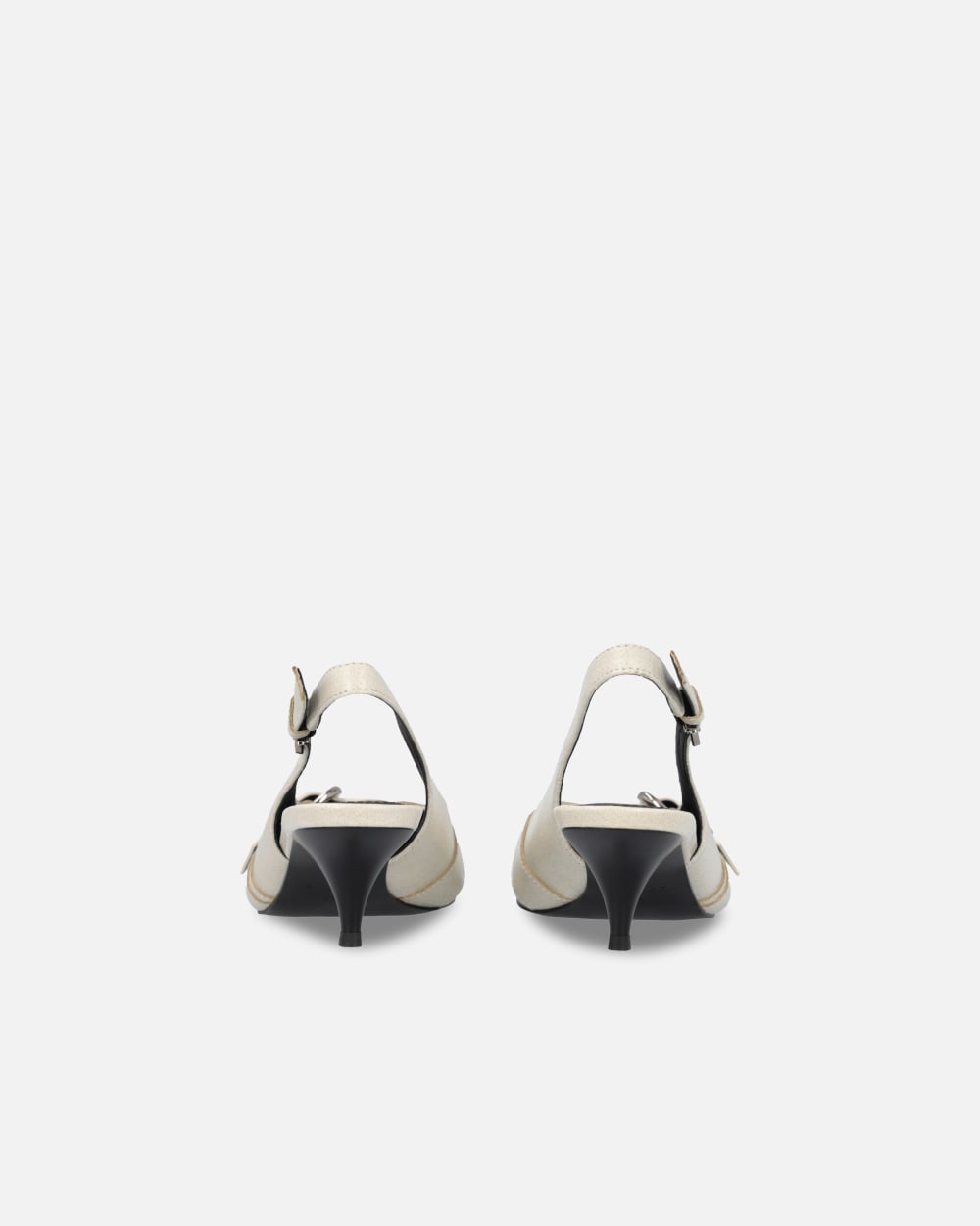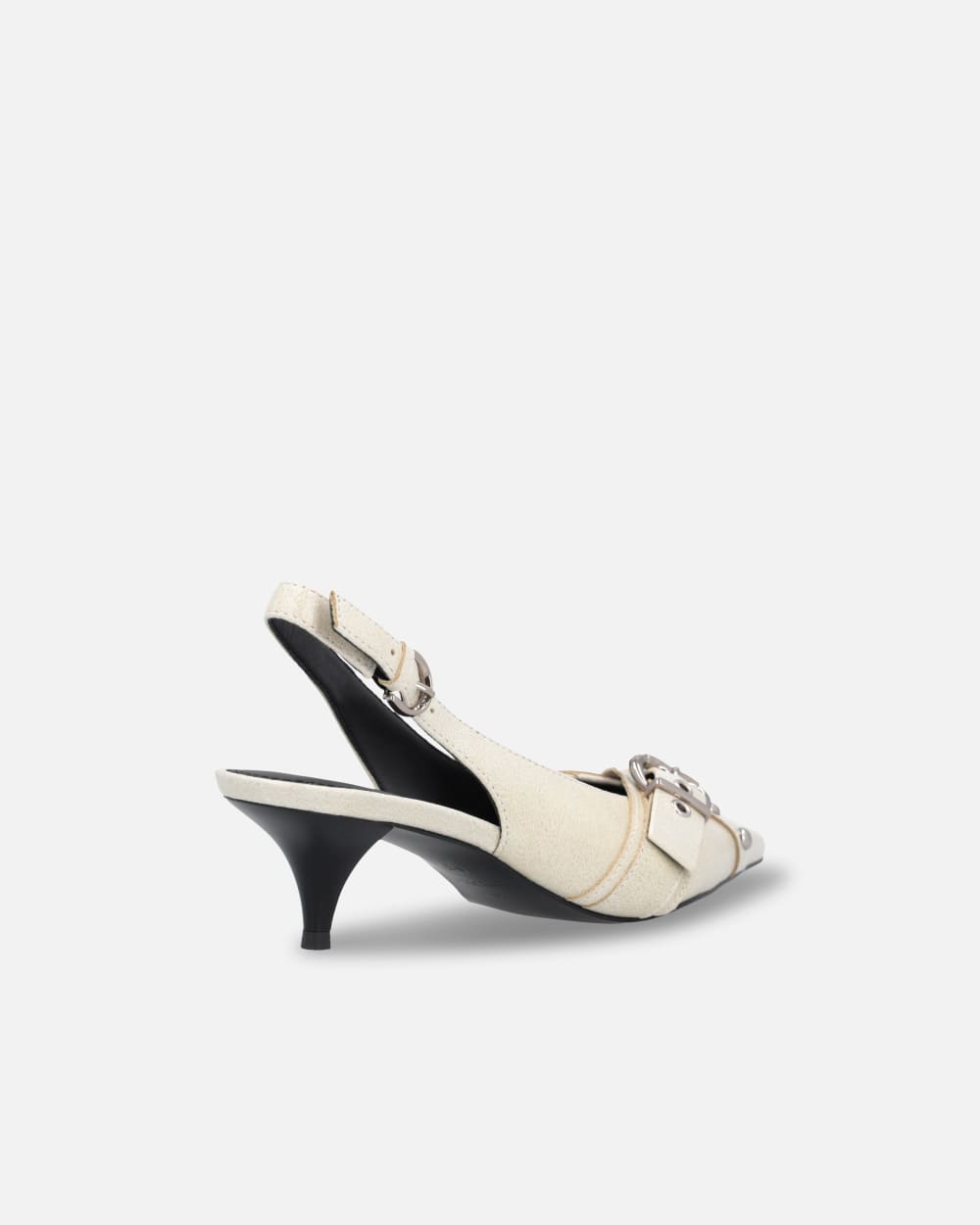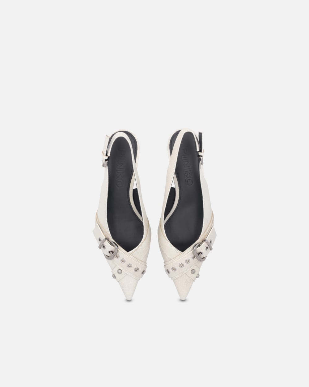 Scarpe slingback in pelle, con applicazione di borchie e cinturino con fibbia metallica a forma di cuore davanti. Punta sfilata, cinturino regolabile con piccola fibbia in metallo di forma circolare. Suola in tunit, un materiale sintetico con caratteristiche simili al cuoio, con tacco kitten heel 5 cm, soletta e fodera in pelle.