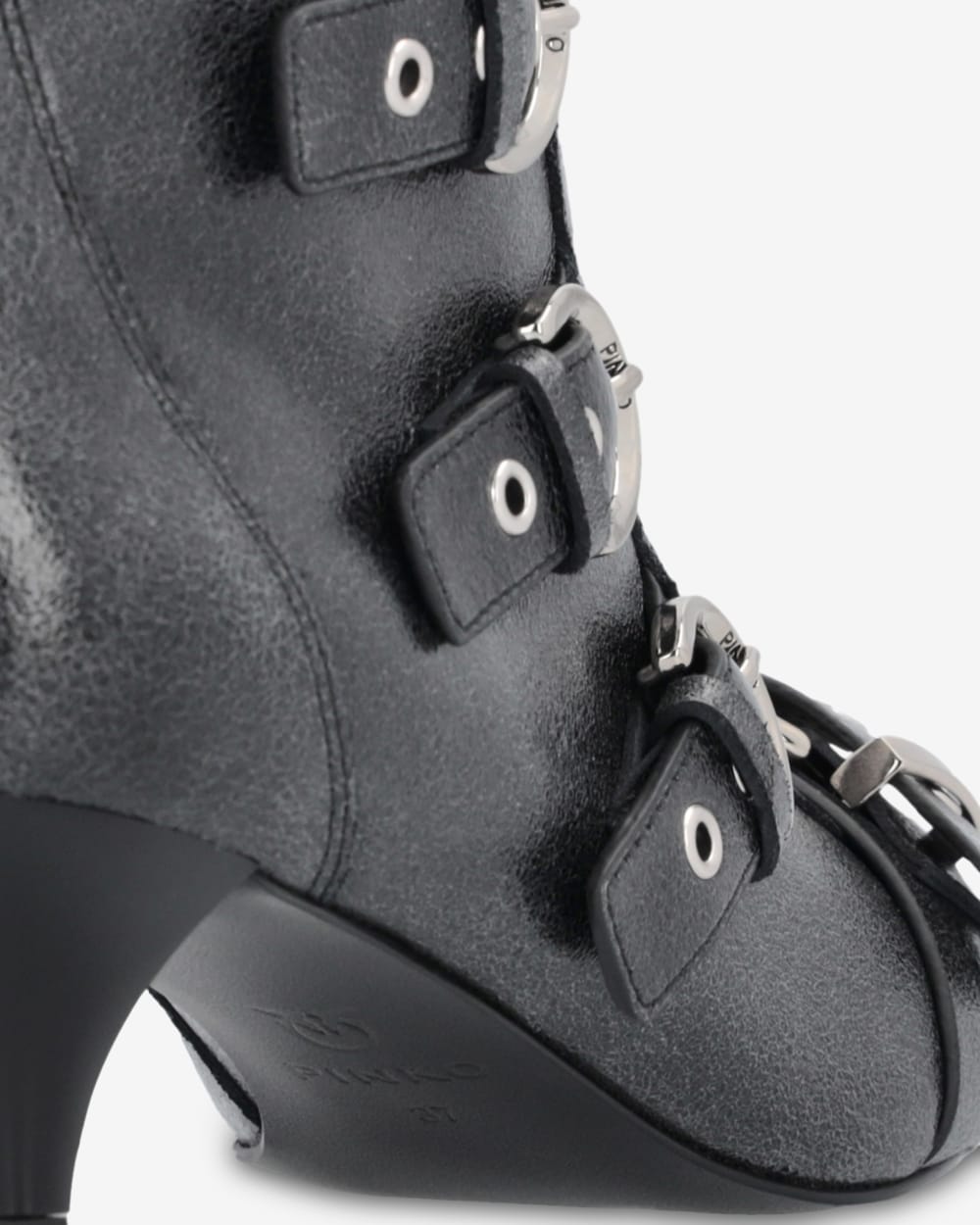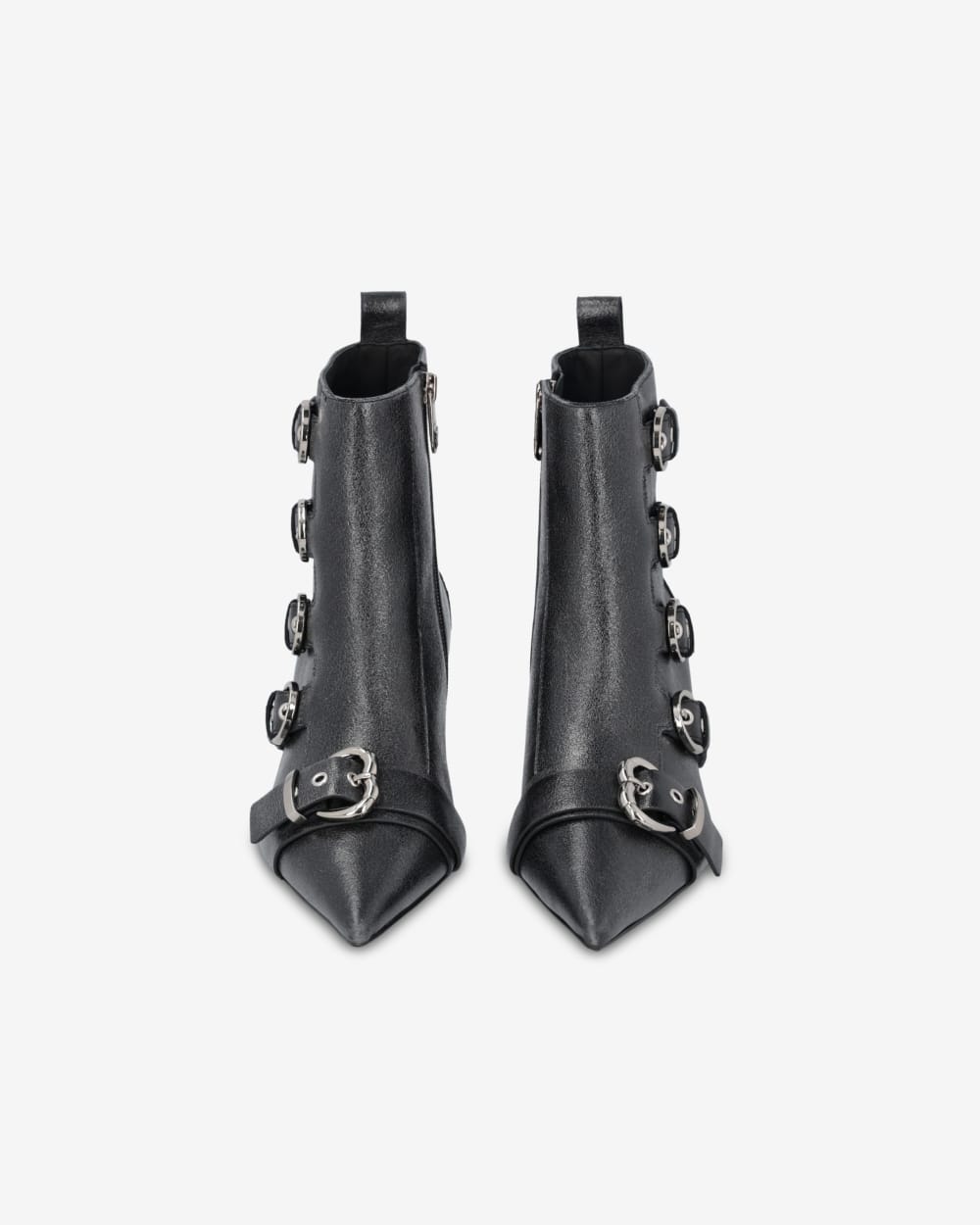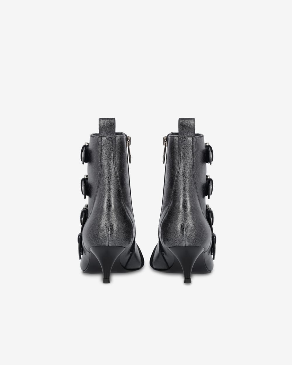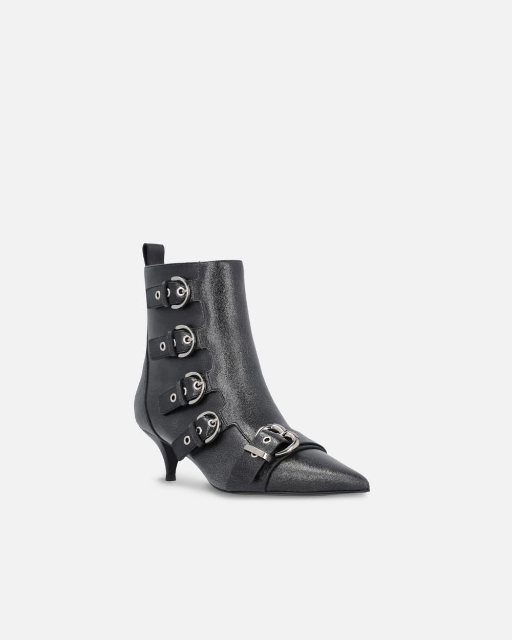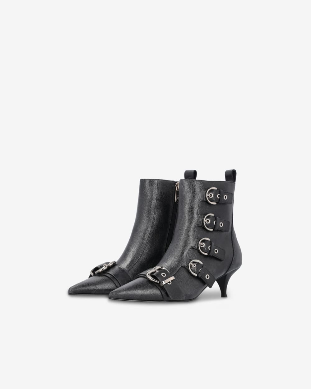 Stivaletti alla caviglia in pelle con cinturini e fibbie in metallo sia davanti che sul gambale. Punta sfilata e zip in metallo sul lato interno del gambale per facilitare l’indosso. Suola in tunit, un materiale sintetico con caratteristiche simili al cuoio, con tacco kitten heel 5 cm, soletta e fodera in pelle.