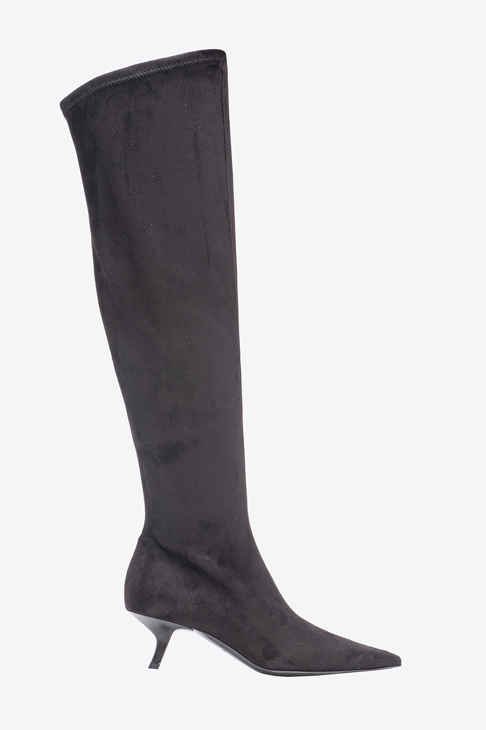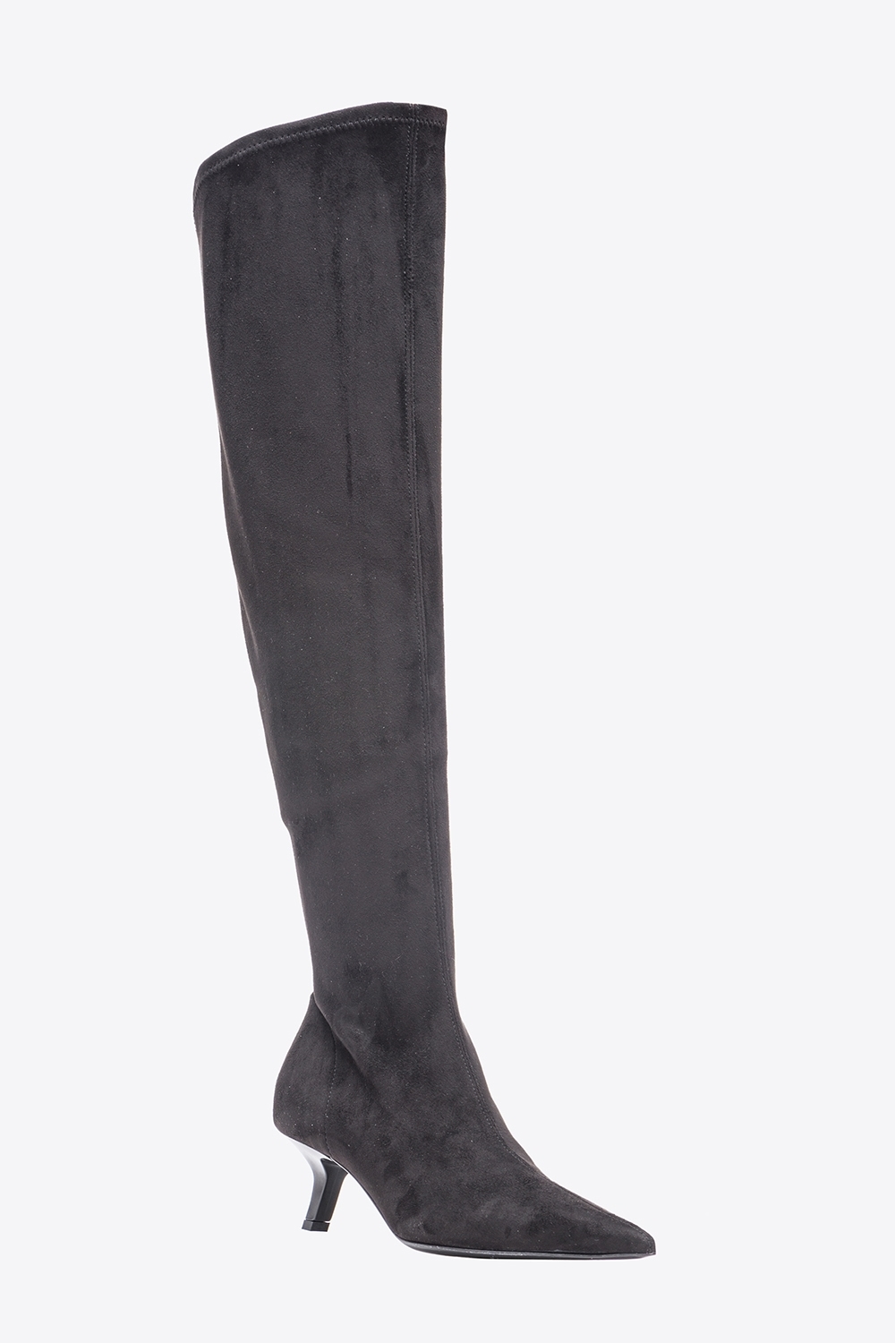 Stivali cuissard alti in tessuto effetto pelle scamosciata, gambale alto 50 cm. Punta dalla linea sfilata e tacco 5 cm, rientrante laccato. Fodera interna in pelle e suola in cuoio con isola antiscivolo. Completi di zip a mezza altezza nella parte interna del gambale, per facilitarne l’indosso.